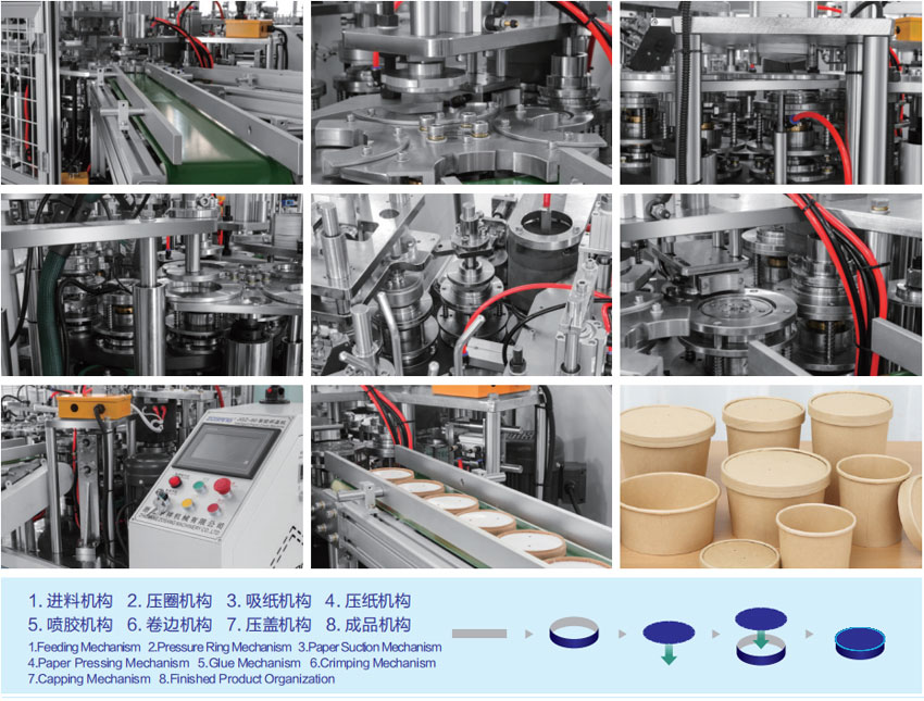 主要生产纸质汤碗纸盖、方便面纸盖、咖啡杯盖、冰激淩盖等纸质容器盖子的理想设备。操作便捷、性能稳定、占地少、效益高、是投资创业的推荐目标。
